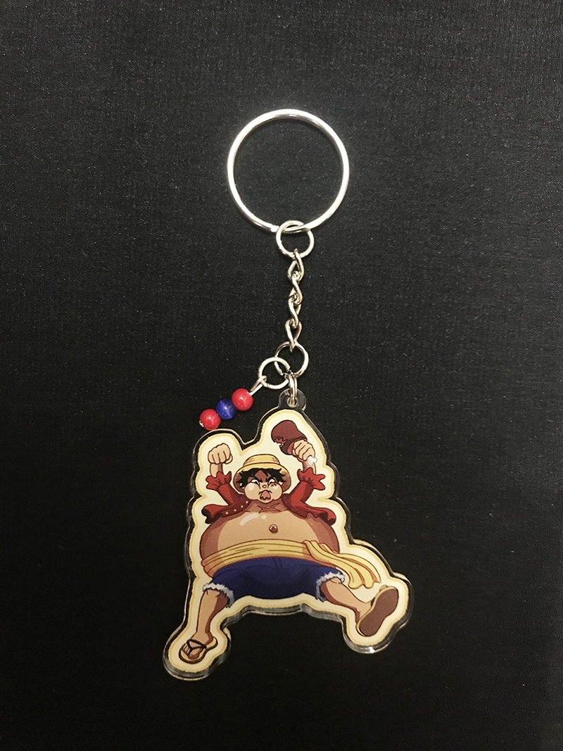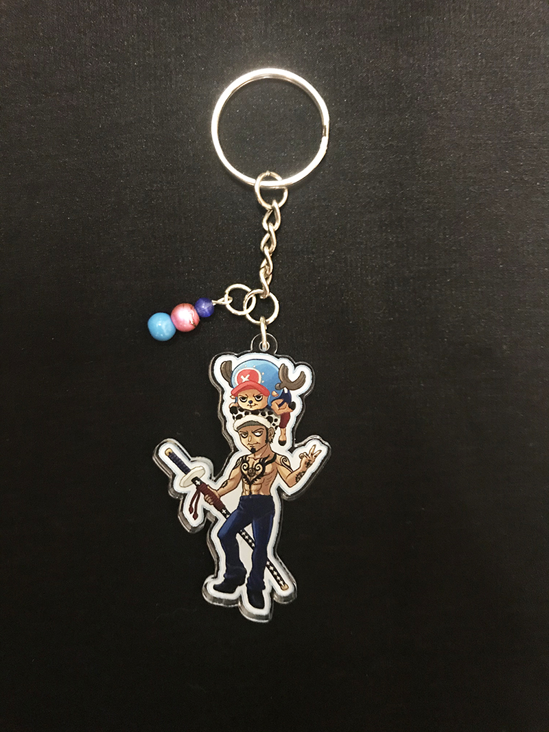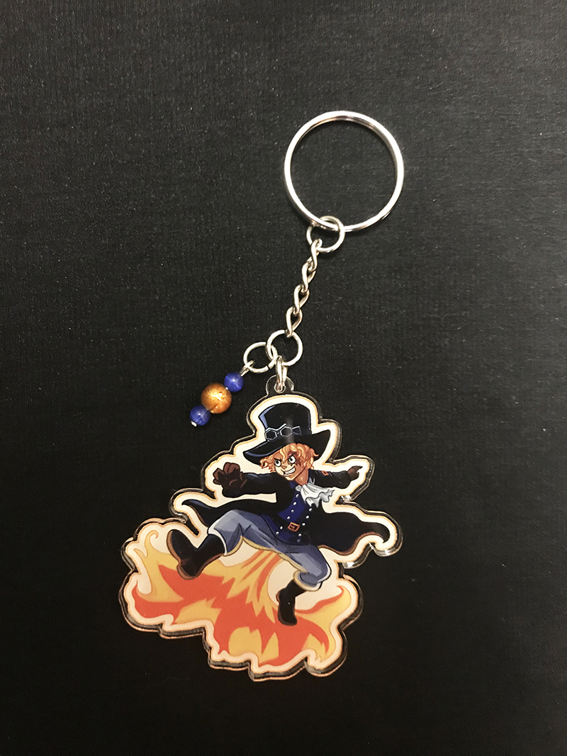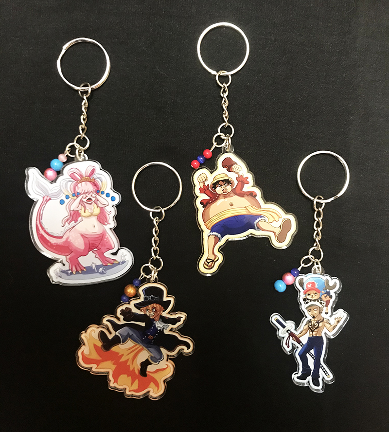 Single-sided 2.5" acrylic keychains featuring art of Luffy, Sabo, Law/Chopper, and Shirahoshi (as an adorable kaiju!) Each keychain features a matching bead accent.
